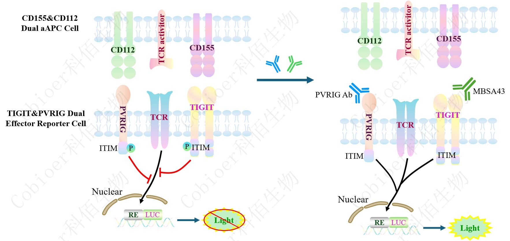 CD155&CD112 Dual aAPC Cell 作為 TIGIT&PVRIG Dual Effector Reporter Cell 的靶細(xì) 胞,很好的模擬了體內(nèi) TIGIT&PVRIG 的信號(hào)轉(zhuǎn)導(dǎo)過(guò)程,原理見(jiàn)下圖所示。