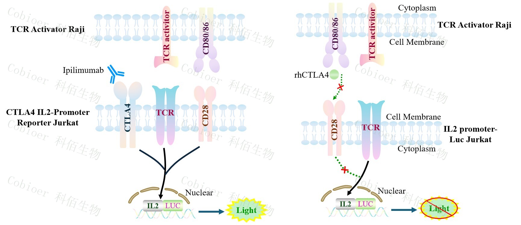 TCR Activator Raji 報告基因藥靶模型很好的模擬了體內(nèi) CD28&CD80/CD86 或者CTLA4 的信號轉(zhuǎn)導過程,原理見下圖所示。![]() Figure 1. TCR Activator Raji 細胞模型原理圖 |