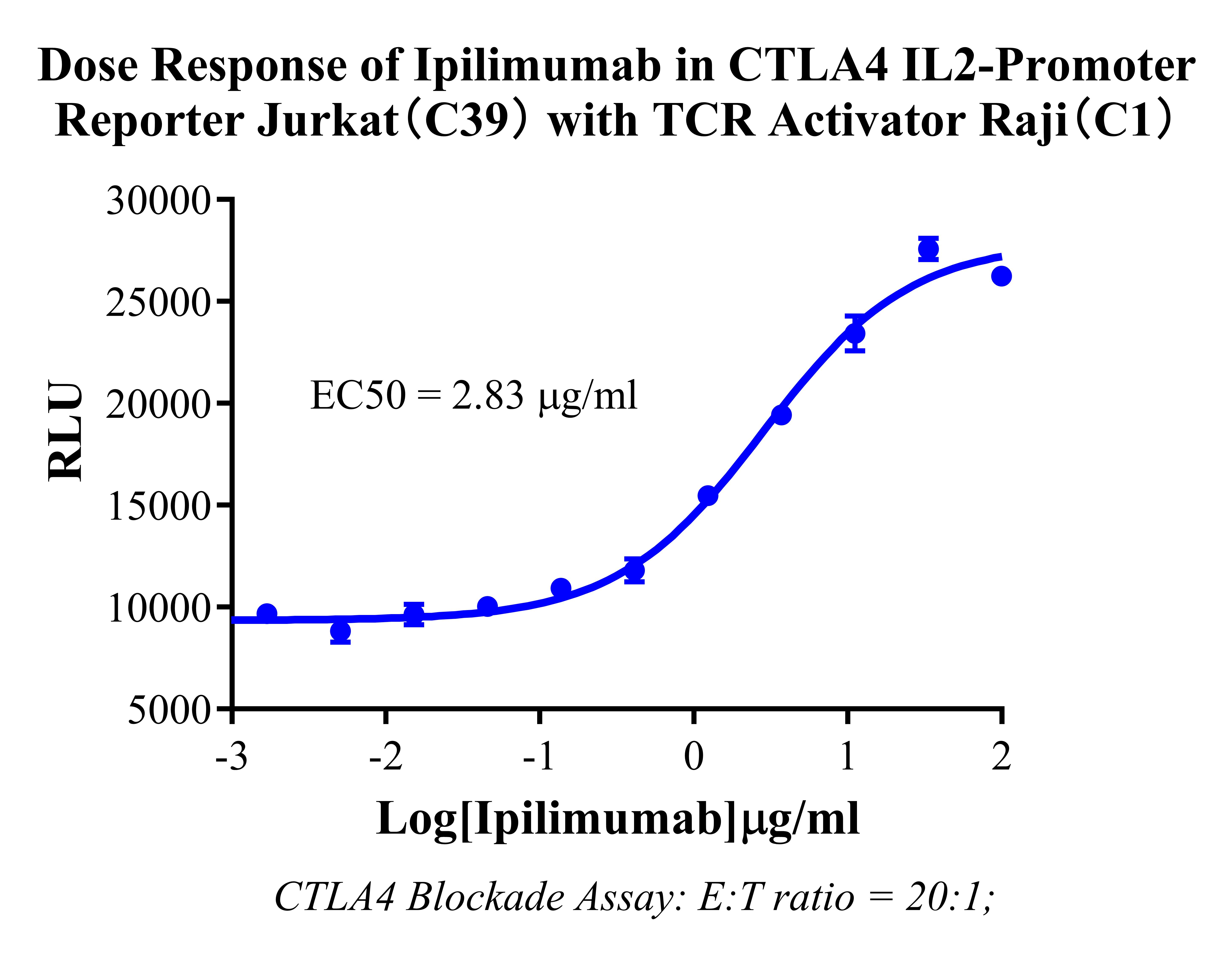 Figure 5. Dose Response of Ipilimumab in CTLA4 IL-2 Promoter Reporter-Jurkat (C39)with TCR Activitor Raji (C1).