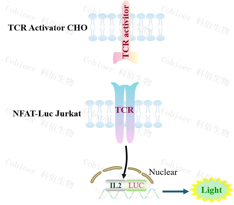 TCR Activator CHO 報告基因藥靶模型很好的模擬了體內(nèi) TCR 的信號轉(zhuǎn)導(dǎo)過程,原理見下圖所示。![]() Figure 1. TCR Activator CHO 細胞模型原理圖 |