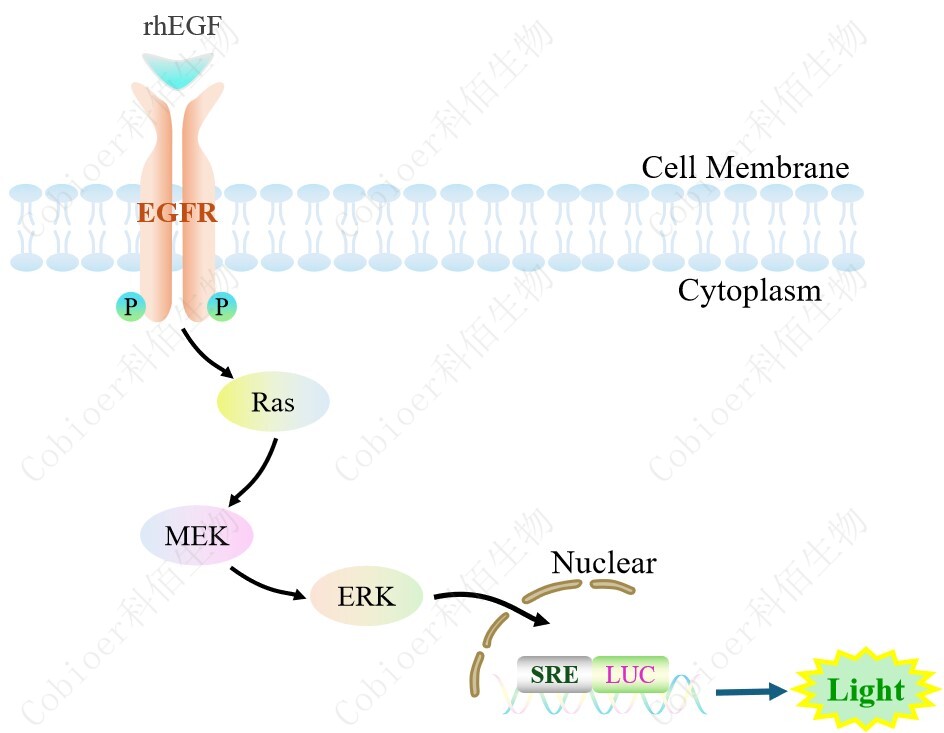SRE-Luc HEK293 報(bào)告基因細(xì)胞是由 SRE 調(diào)控并表達(dá) Luc 熒光素酶報(bào) 告基因的 HEK293 細(xì)胞。EGF 與受體結(jié)合,激活 SRE 的原理見下圖所示。![]() Figure 1. SRE-Luc HEK293 細(xì)胞模型原理圖