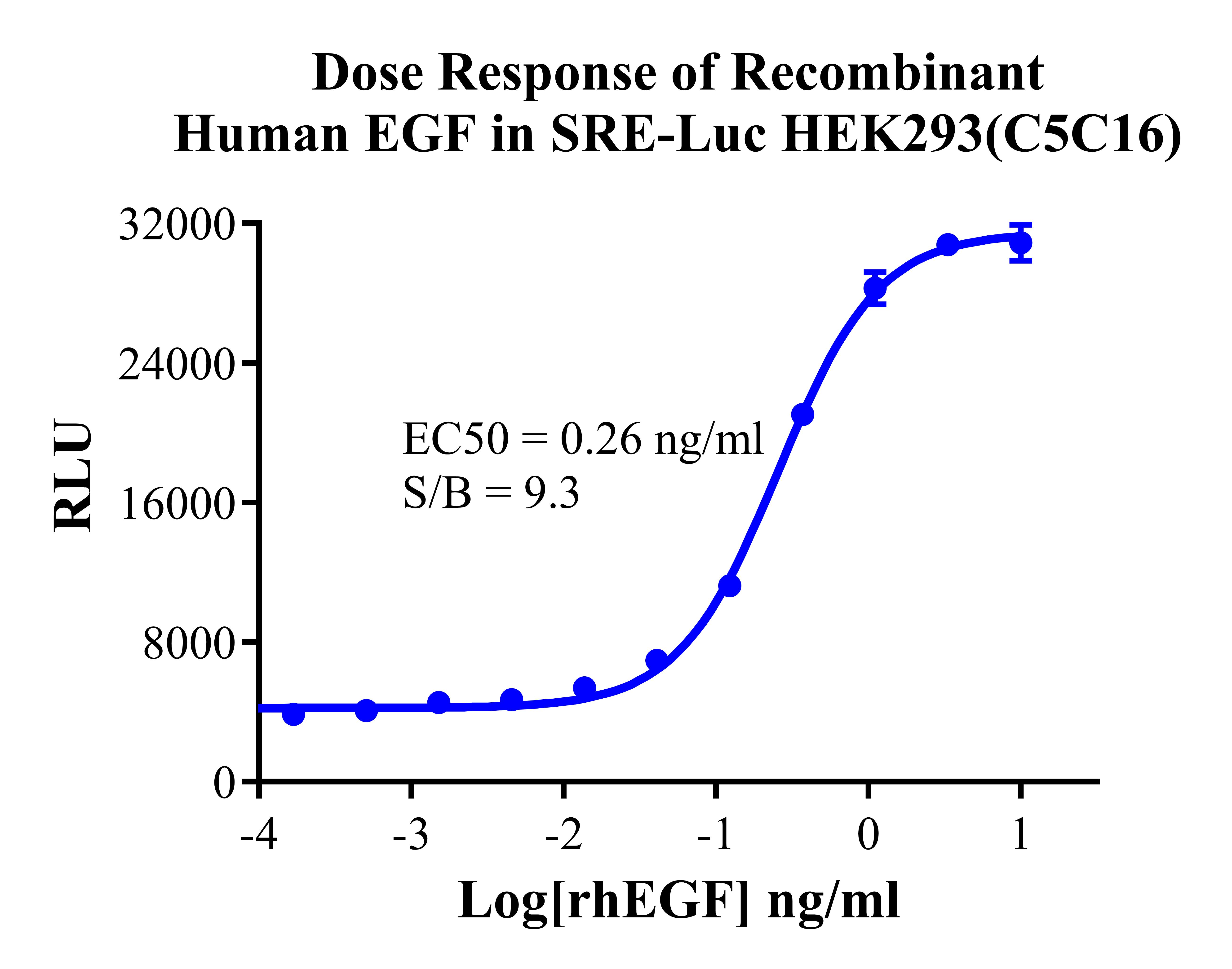 Figure 2. Detect Luciferase assay by Ultra Luciferase Detection Kit CBPH0001(we strongly suggest to purchase from Cobioer). Dose Response of Recombinant Human EGF in SRE-Luc HEK293 (C5C16). |