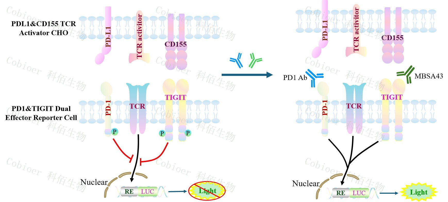 PD1&TIGIT Dual Effector Reporter Cell 報告基因藥靶模型很好的模擬了體內PD1&TIGIT 的信號轉導過程,原理見下圖所示。