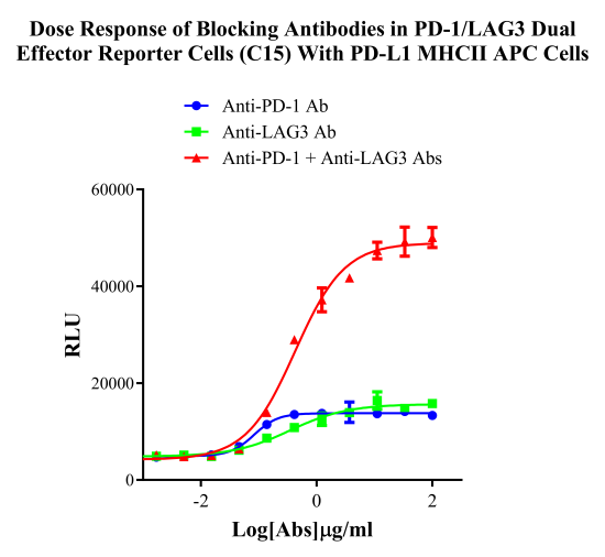 Figure 2. Dose Response of Blocking Antibodies in PD-1/LAG3 Dual Effector Reporter Cells (C15) with PD-L1/MHCII APC Cells.