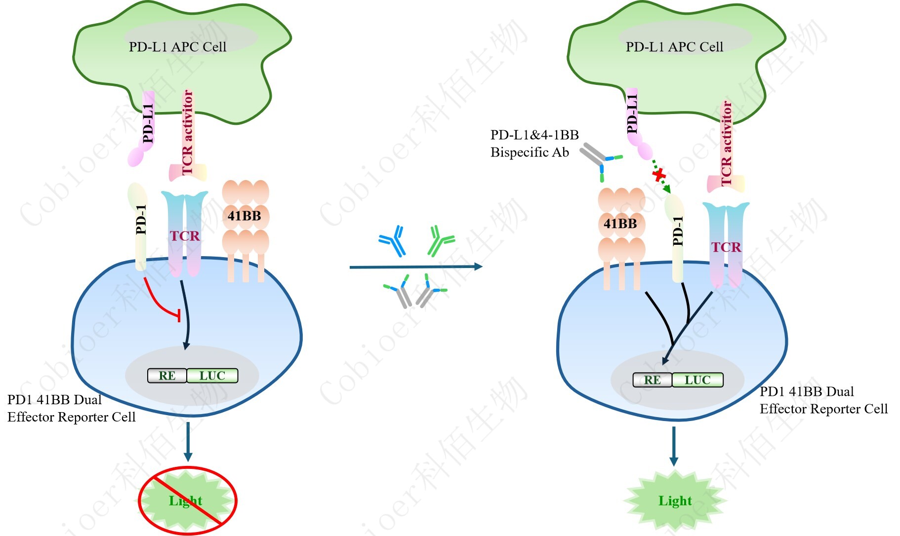 PD1 4-1BB Dual Effector Reporter Cell 報告基因藥靶模型很好的模擬了體內(nèi) PD1&4- 1BB 的信號轉(zhuǎn)導過程,原理見下圖所示。