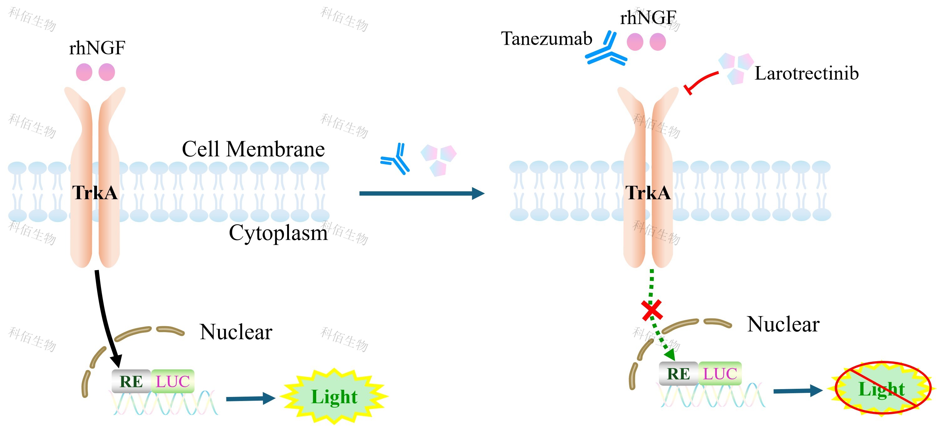 NGF/TRKA Effector Reporter Cell 報告基因藥靶模型很好的模擬了體內 NGF/TRKA 的 信號轉導過程,原理見下圖所示。