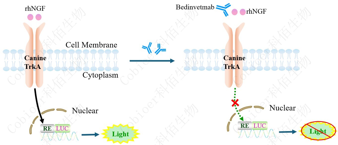 NGF/Canine TRKA Effector Reporter Cell 報告基因藥靶模型很好的模擬了體內(nèi) NGF/Canine TRKA 的信號轉(zhuǎn)導(dǎo)過程,原理見下圖所示。