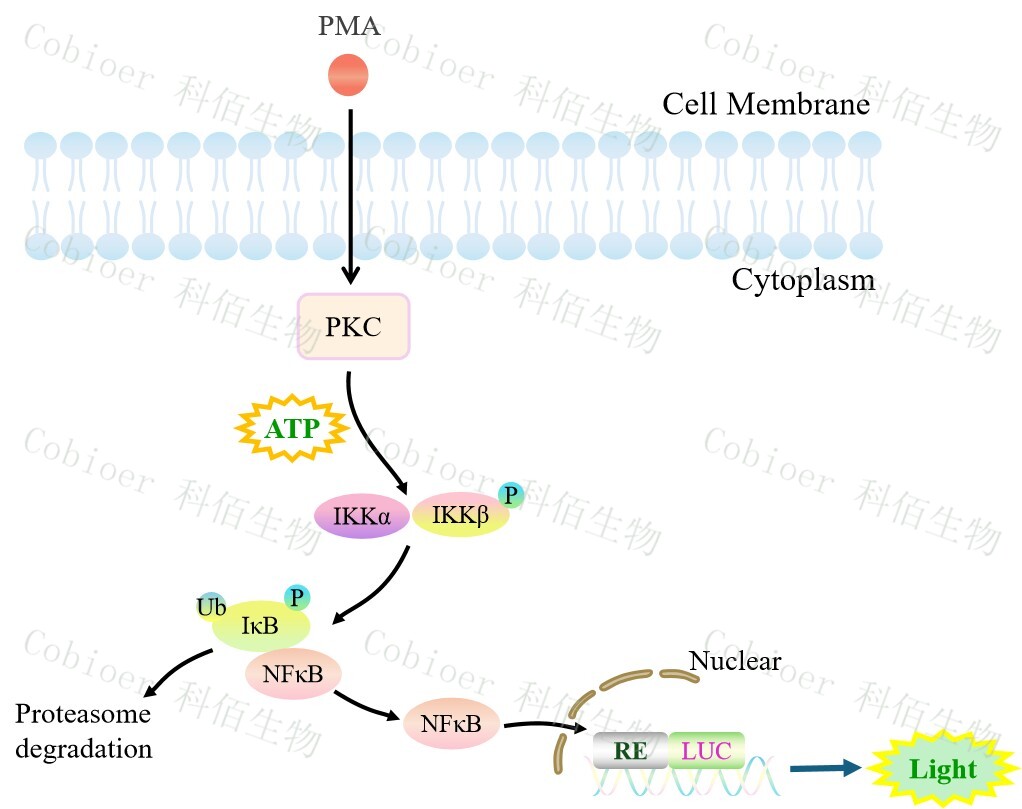 NFκB-Luc Jurkat 報(bào)告基因細(xì)胞是由 NFκB 調(diào)控并表達(dá) Luc 熒光素酶報(bào) 告基因的 Jurkat細(xì)胞。PMA 是 DAG(二酯酰甘油)的類(lèi)似物,可自由的通過(guò)細(xì)胞膜,直接 作用于細(xì)胞活化信號(hào)轉(zhuǎn)導(dǎo)通路上的 PKC,原理見(jiàn)下圖所示。![]() Figure 1. NFκB-Luc Jurkat 細(xì)胞模型原理圖