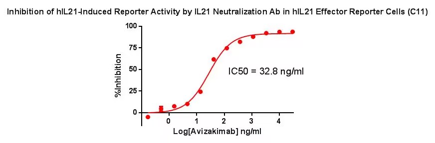 Figure 3.Inhibition of hIL21-Induced Reporter Activity by IL21 Neutralization Ab in hIL21 Effector Reporter Cells (C11). |
