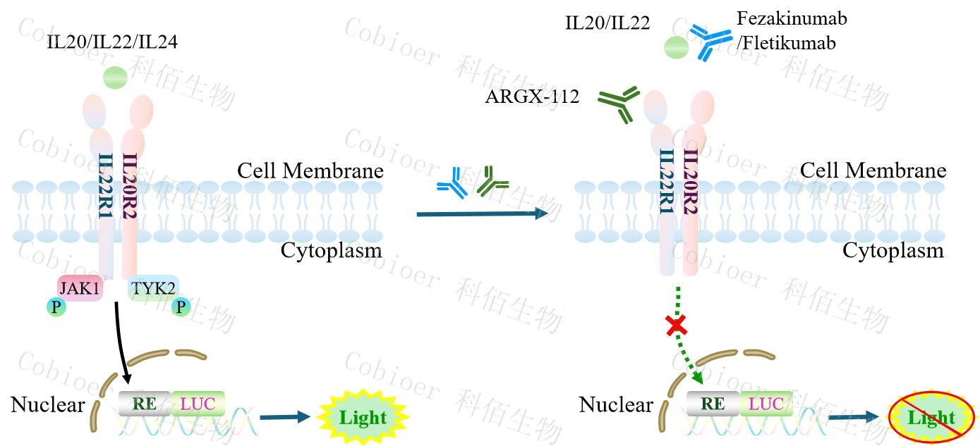 hIL20/IL22/IL24 Triple Effector Reporter Cell 報(bào)告基因藥靶模型很好的模擬了體內(nèi)IL20/IL22/IL24 的信號轉(zhuǎn)導(dǎo)過程,原理見下圖所示。