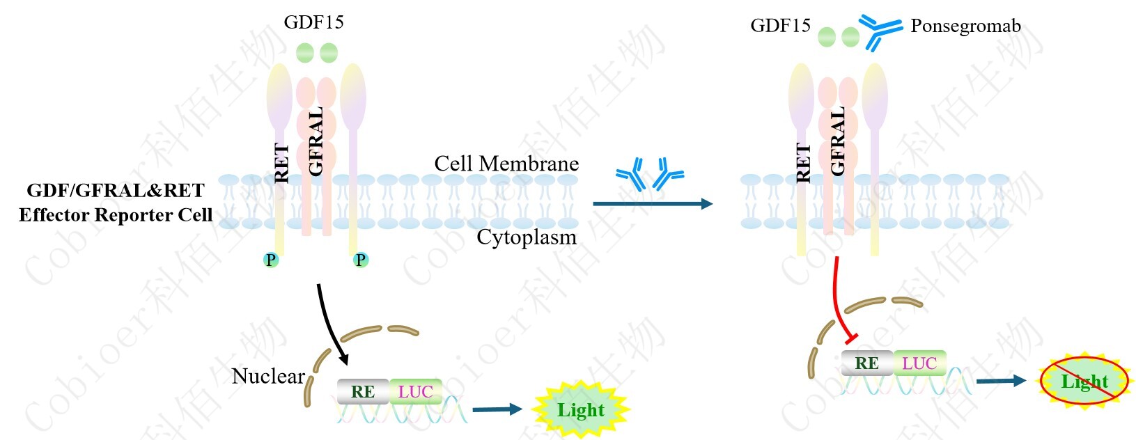 GDF/GFRAL&RET Effector Reporter Cell 報(bào)告基因藥靶模型很好的模擬了體內(nèi) GDF 的 信號(hào)轉(zhuǎn)導(dǎo)過程,原理見下圖所示。![]() Figure 1. GDF/GFRAL&RET Effector Reporter Cell 模型原理圖 |
