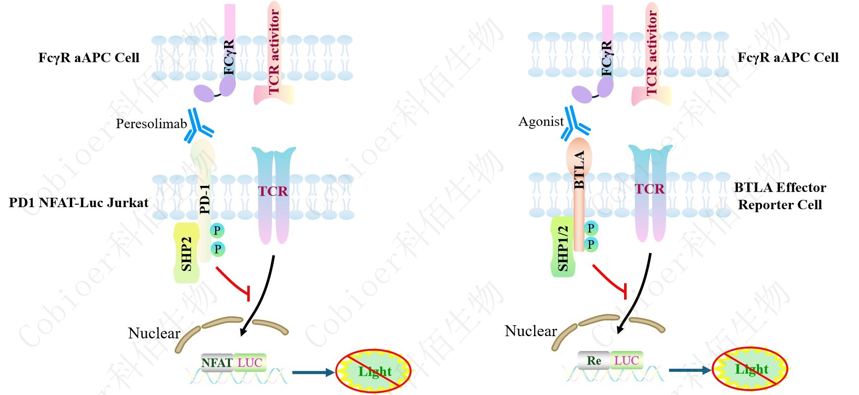 FcγR aAPC Cell在基礎(chǔ)細(xì)胞上穩(wěn)定表達(dá) FcγR 和 aAPC。FcγR aAPC Cell 作為 PD1 NFAT-Luc Jurkat Cell/BTLA Effector Reporter Cell 的靶細(xì)胞進(jìn)行功能檢測(cè)的原 理圖見下圖所示。![]() Figure 1. FcγR aAPC Cell 的原理圖 |