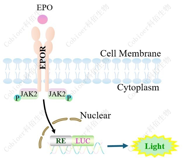 EPO Effector Reporter Cell 報(bào)告基因藥靶模型很好的模擬了體內(nèi) EPO&EPOR 的信號(hào)轉(zhuǎn) 導(dǎo)過程,原理見下圖所示。![]() Figure 1. EPO Effector Reporter Cell 細(xì)胞模型原理圖 |
