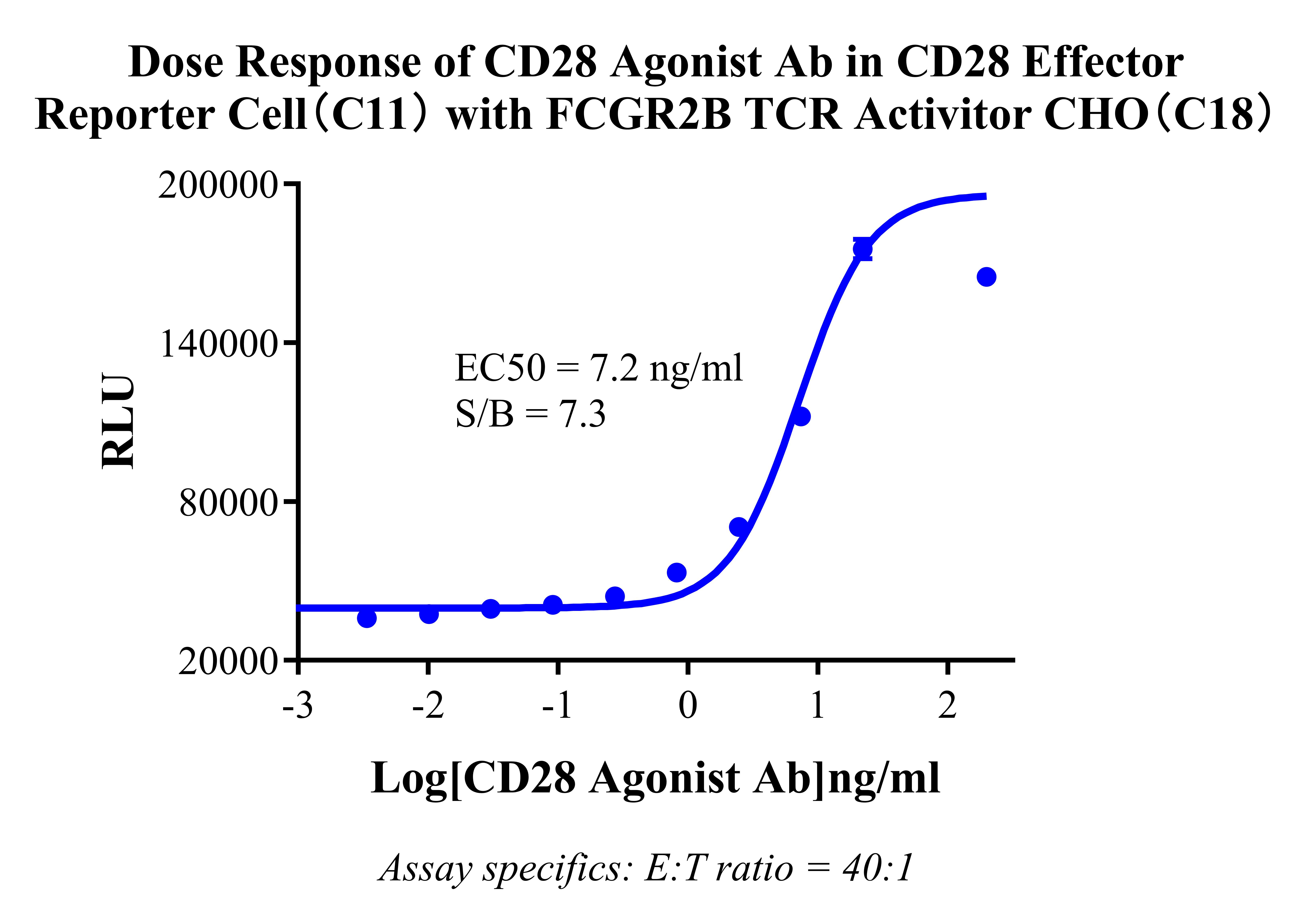 Figure 2. Dose Response of CD28 Agonist Ab in CD28 Effector Reporter Cell(C11) with FCGR2B TCR Activitor CHO Cell,(C18).