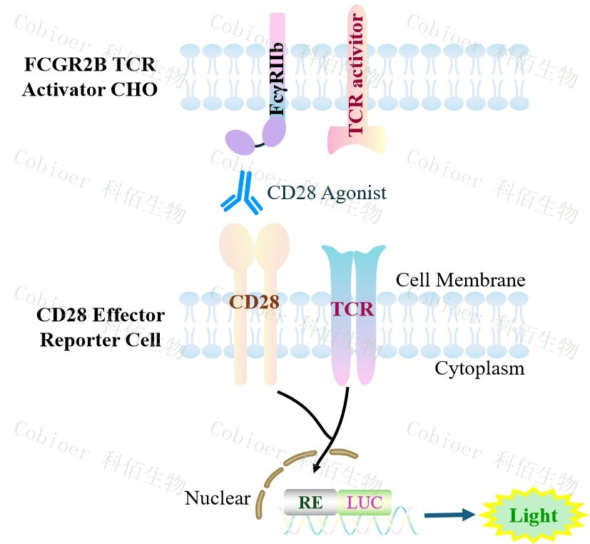 CD28 Effector Reporter Cell 報(bào)告基因藥靶模型很好的模擬了體內(nèi) CD28 的信號轉(zhuǎn)導(dǎo)過 程,原理見下圖所示。 ![]() Figure 1. CD28 Effector Reporter Cell 細(xì)胞模型原理圖 |