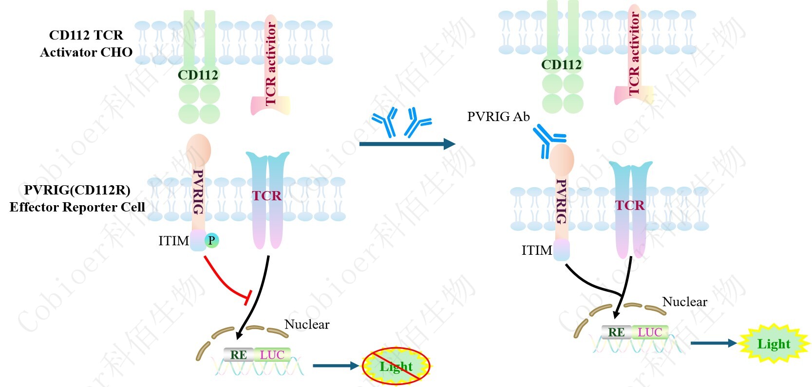 PVRIG(CD112R) Effector Reporter Cell 報(bào)告基因藥靶模型很好的模擬了體內(nèi) PVRIG 的 信號(hào)轉(zhuǎn)導(dǎo)過(guò)程,原理見(jiàn)下圖所示。