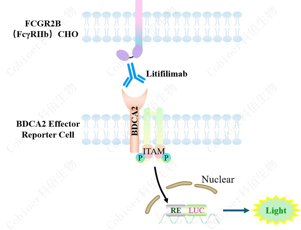 BDCA2 Effector Reporter 報告基因藥靶模型很好的模擬了體內(nèi) BDCA2 的信號轉(zhuǎn)導(dǎo)過程, 原理見下圖 所示。![]() Figure 1. BDCA2 Effector Reporter 細(xì)胞模型原理圖