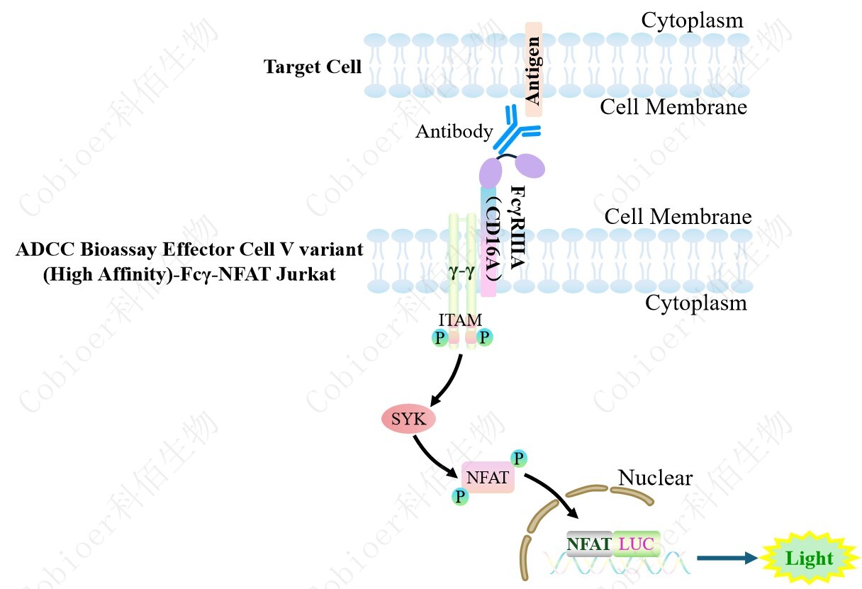 ADCC Bioassay Effector Cell V variant (High Affinity)-Fcγ-NFAT Jurkat 報告基因藥靶模 型很好的模擬了體內(nèi) ADCC 的信號轉(zhuǎn)導(dǎo)過程,原理見下圖所示。