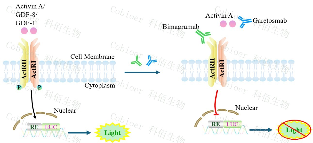 Activin A Effector Reporter Cell 報告基因藥靶模型很好的模擬了體內(nèi) Activin A 的信號轉(zhuǎn)導過程,原理見下圖所示。![]() Figure 1. Activin A Effector Reporter Cell 細胞模型原理圖 |