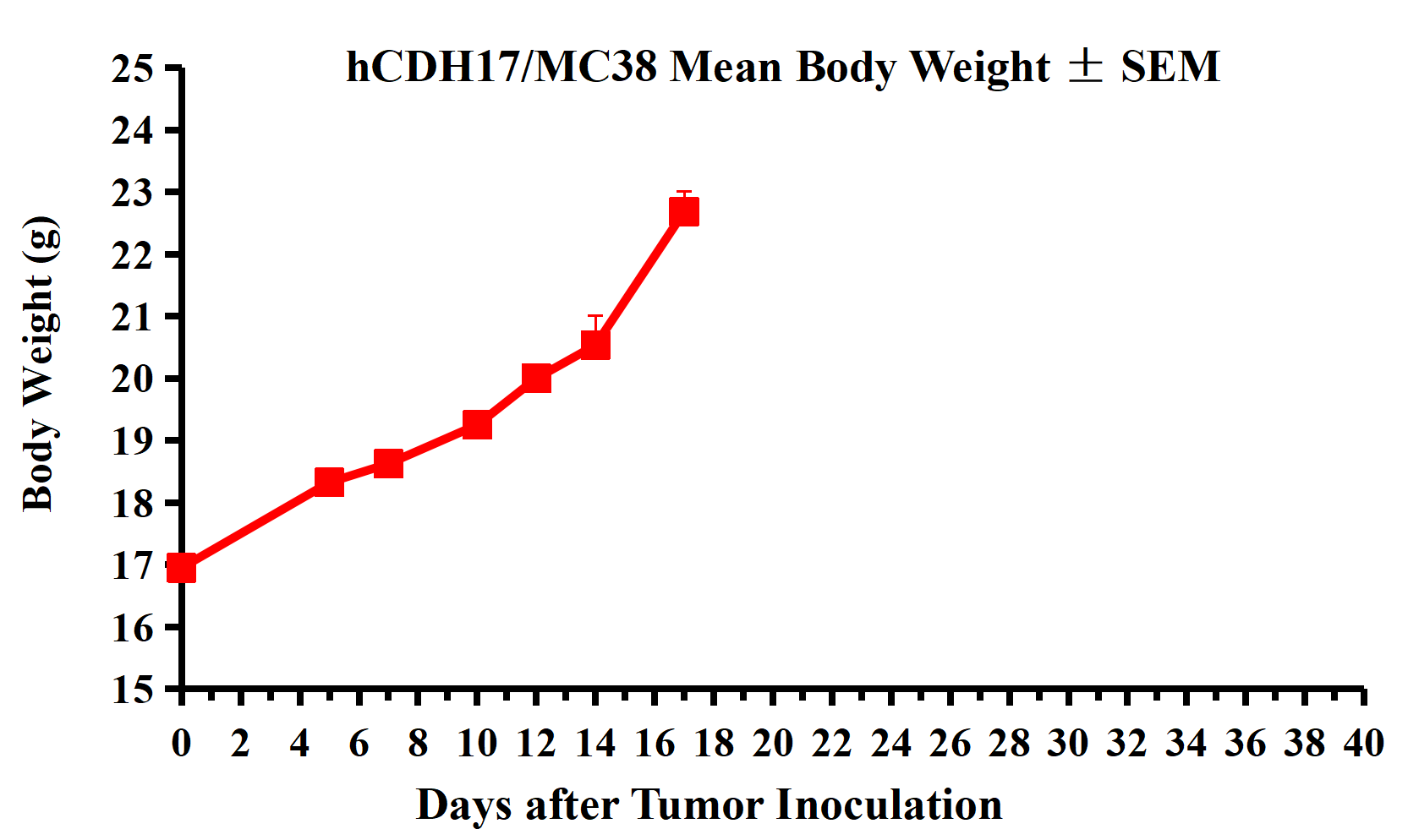 Figure 2. hCDH17/MC38 Mean Body Weight ± SEM.
