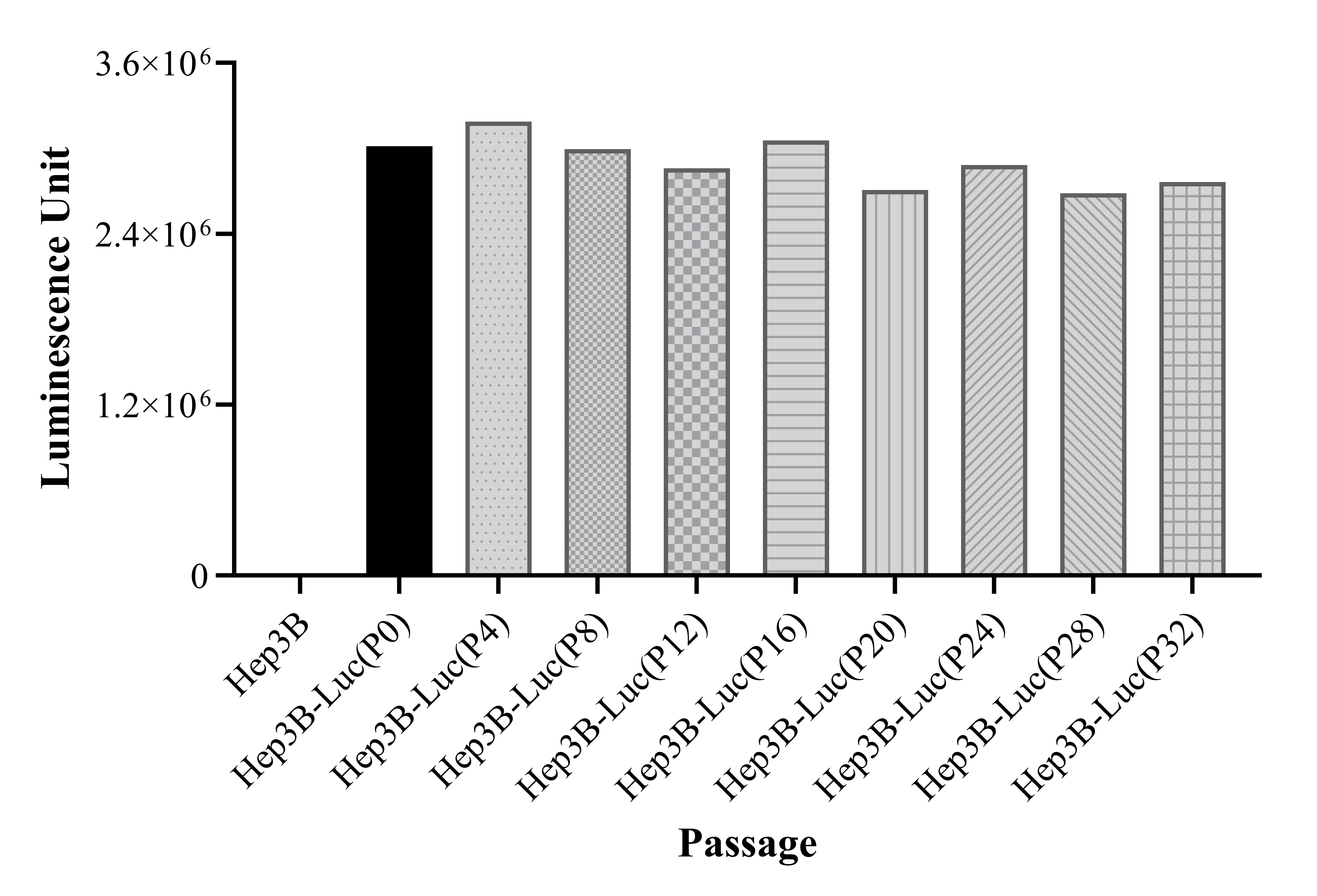 Figure 1. Stablity test results. Hep3B-Luc cells showed at least 32 passage stability with similar luminescence unit.