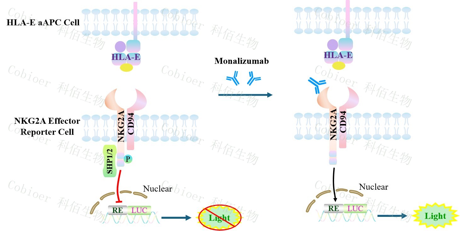 NKG2A Effector Reporter Cell 報告基因藥靶模型很好的模擬了體內(nèi) NKG2A 的信號轉(zhuǎn)導(dǎo)過程,原理見下圖所示。