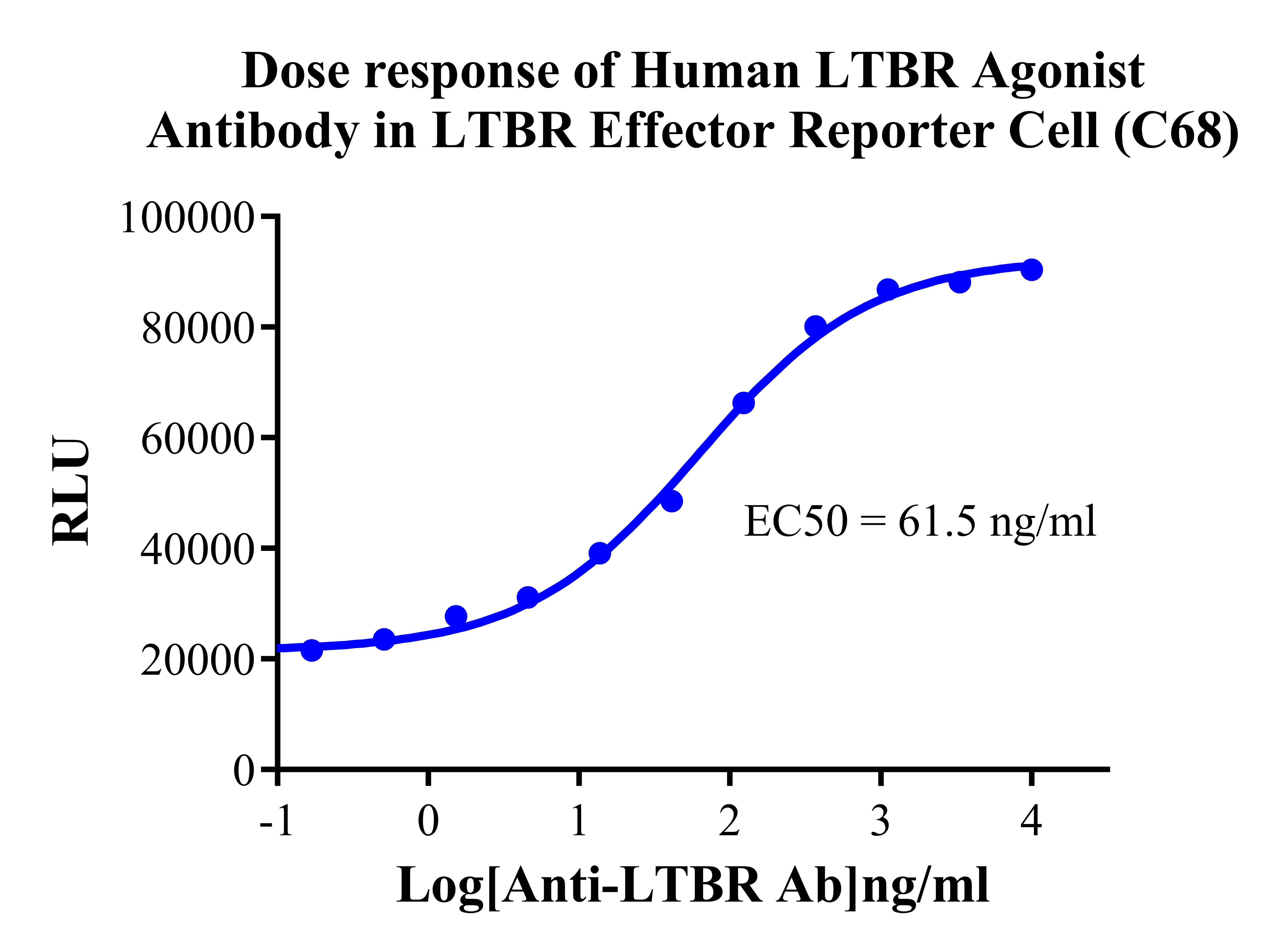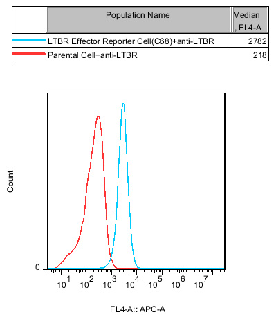 IV. Representative Data![]() Figure 2. Recombinant LTBR Effector Reporter Cell stably expressing LTBR. ![]() Figure 3. Dose Response of Human LTBR Agonist Antibody in LTBR Effector Reporter Cell (C68). |