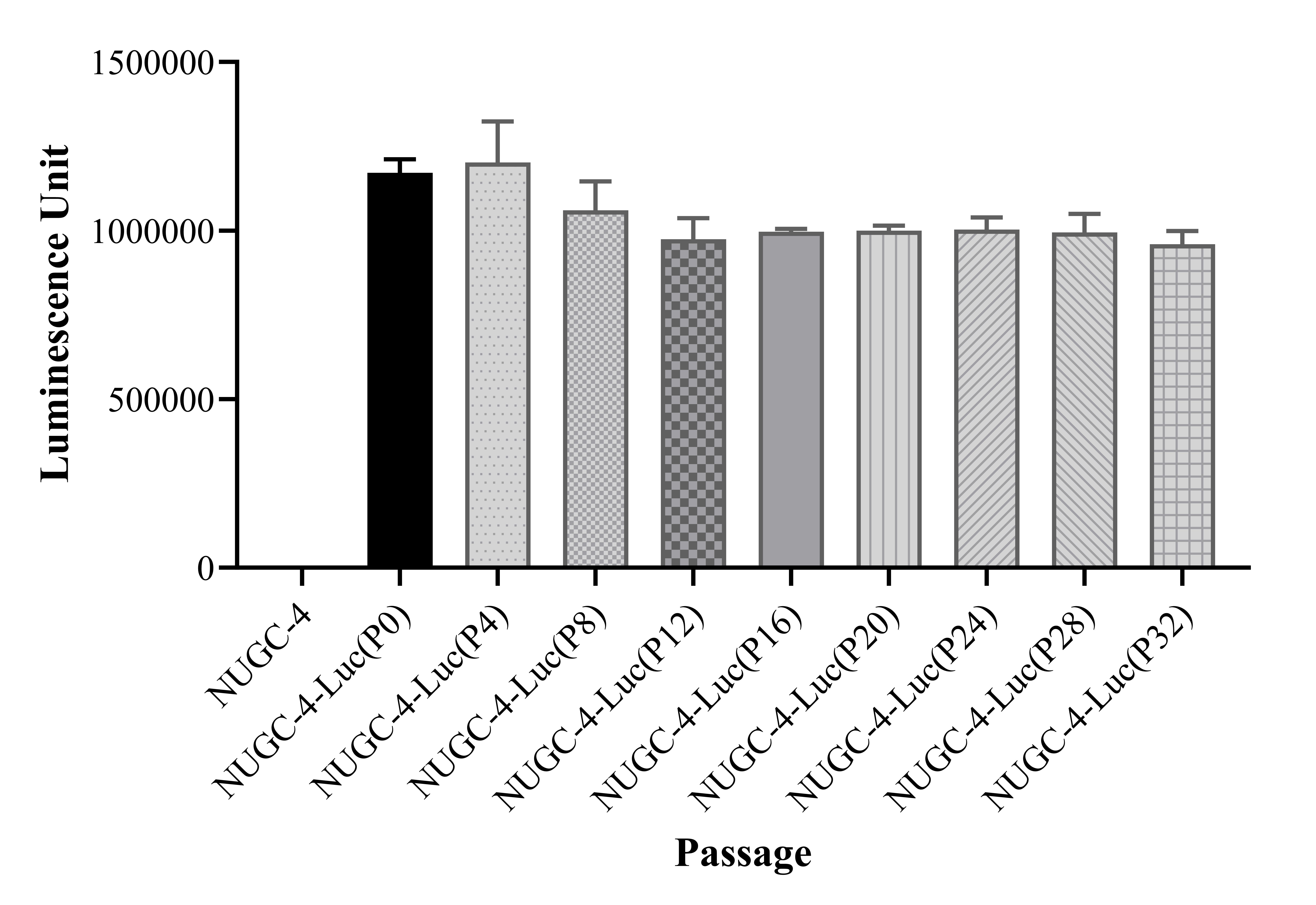 Figure 1. Stablity test results. NUGC-Luc showed at least 32 passage stability with similar luminescence unit. |