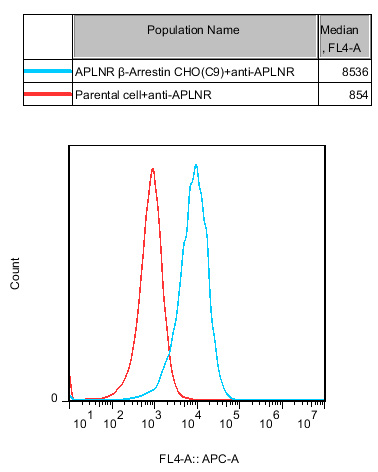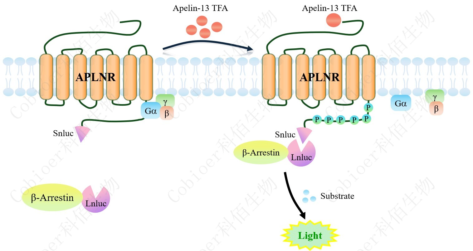 APLNR(APJ) β-Arrestin CHO 報(bào)告基因藥靶模型很好的模擬了體內(nèi) APLNR(APJ) /β-Arrestin 的信號(hào)轉(zhuǎn)導(dǎo)過(guò)程,原理見下圖所示。當(dāng)缺乏配體刺激時(shí),β-Arrestin 不與 APLNR (APJ)結(jié)合,融合β-Arrestin 的熒光素酶處于失活構(gòu)象,當(dāng) APLNR(APJ)遭遇配體刺激 時(shí),融合熒光素酶報(bào)告基因的β-Arrestin 被招募,使熒光素酶報(bào)告基因處于激活狀態(tài),加入 其底物后發(fā)光信號(hào)增強(qiáng)。![]() Figure 1. APLNR(APJ) β-Arrestin CHO 細(xì)胞模型原理圖 |