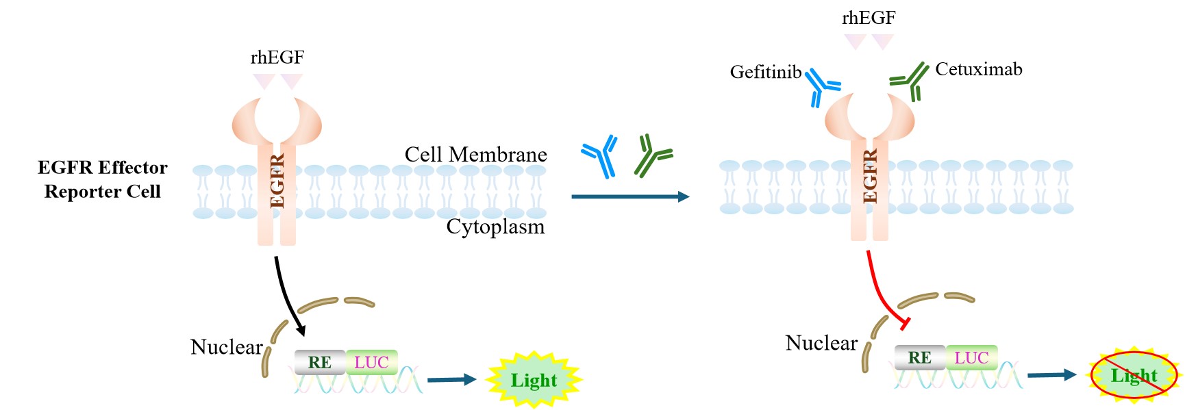 EGFR Effector Reporter Cell 報(bào)告基因藥靶模型很好的模擬了體內(nèi) EGFR 的信號轉(zhuǎn)導(dǎo)過程, 原理見下圖所示。