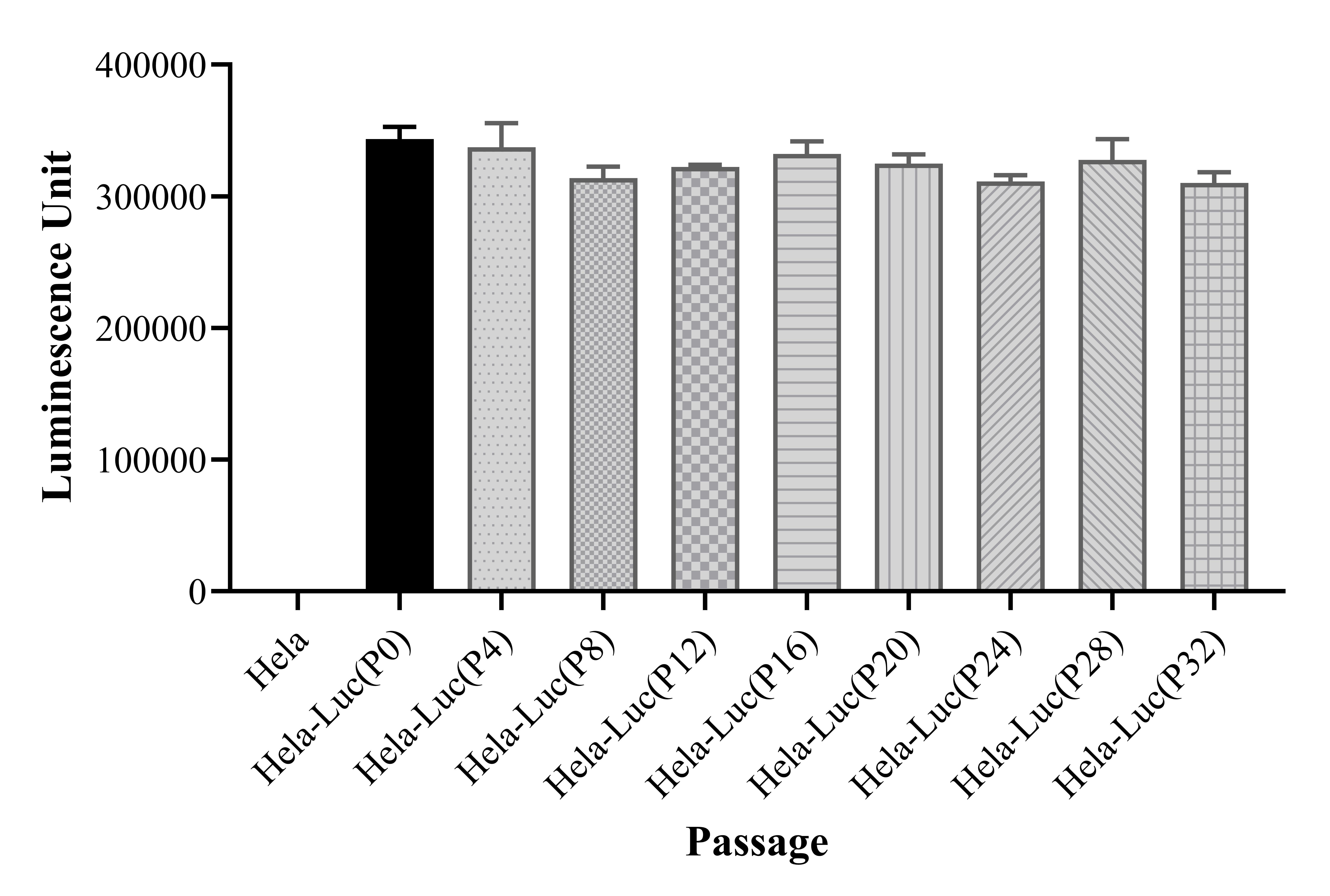 Figure 1. Stablity test results. Hela-Luc showed at least 32 passage stability with similar luminescence unit. |