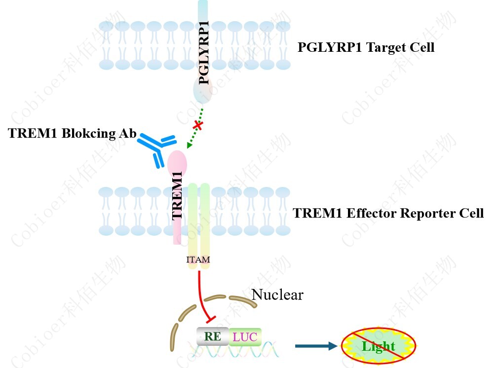 PGLYRP1 Target Cell 作為 TREM1 Effector Reporter Cell 的靶細(xì)胞,很好的模擬了體內(nèi) TREM1 的信號(hào)轉(zhuǎn)導(dǎo)過程,原理見下圖所示。