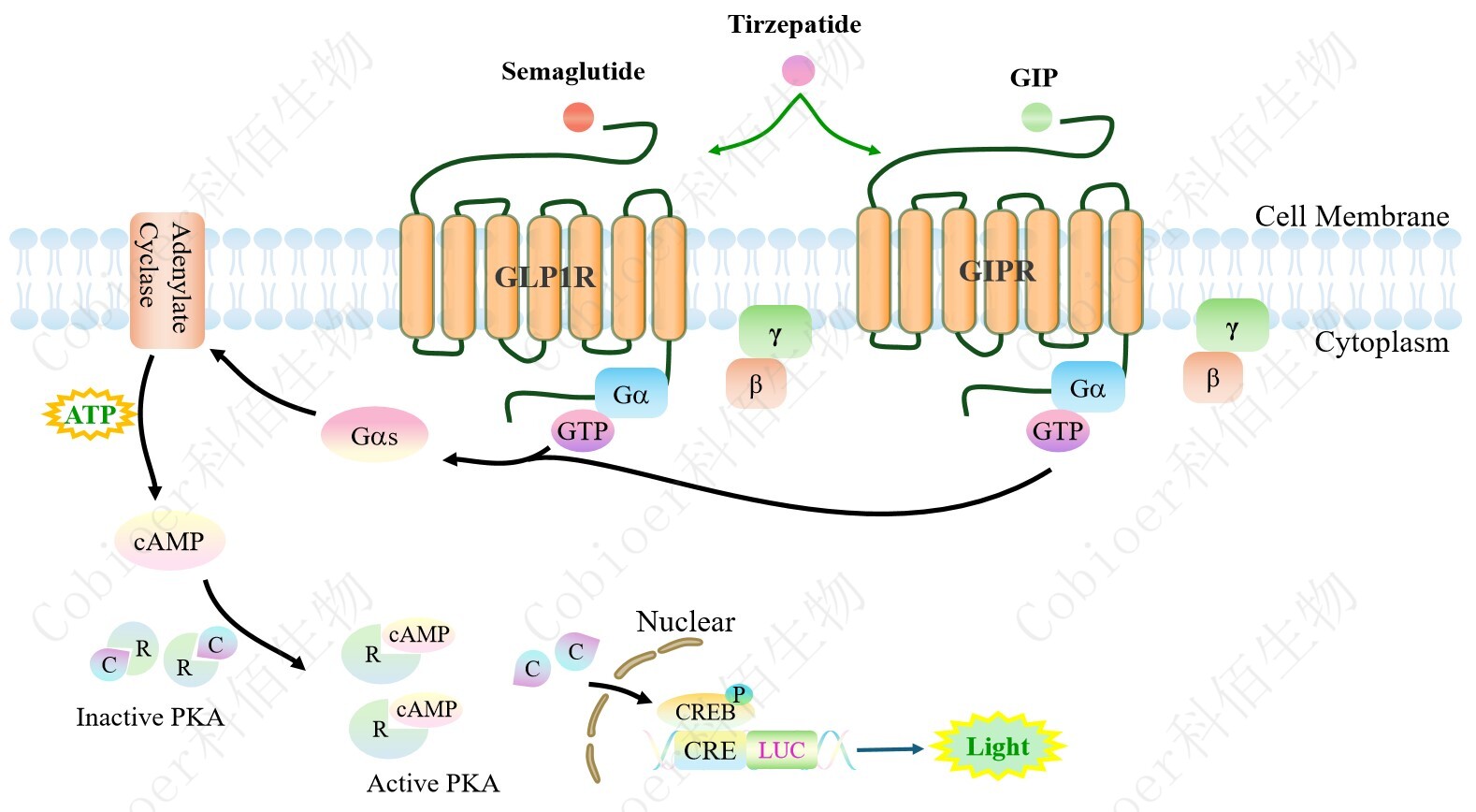 GLP1R&GIPR Dual Reporter Cell 報(bào)告基因藥靶模型很好的模擬了體內(nèi) GLP1R&GIPR的信號(hào)轉(zhuǎn)導(dǎo)過(guò)程,原理見(jiàn)下圖所示。