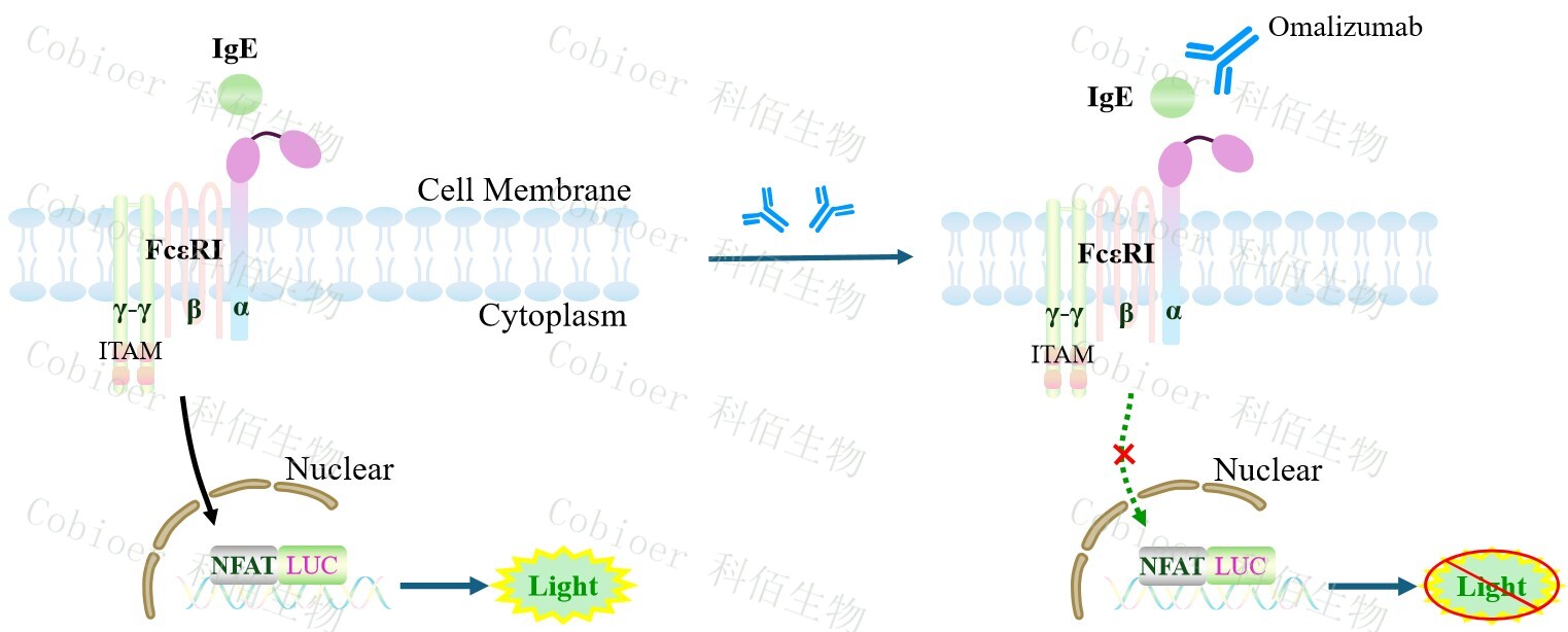 FcεRI Effector Reporter Cell 藥靶模型很好的模擬了 FcεRI的信號(hào)轉(zhuǎn)導(dǎo)過(guò)程,原理見(jiàn)下圖所示。