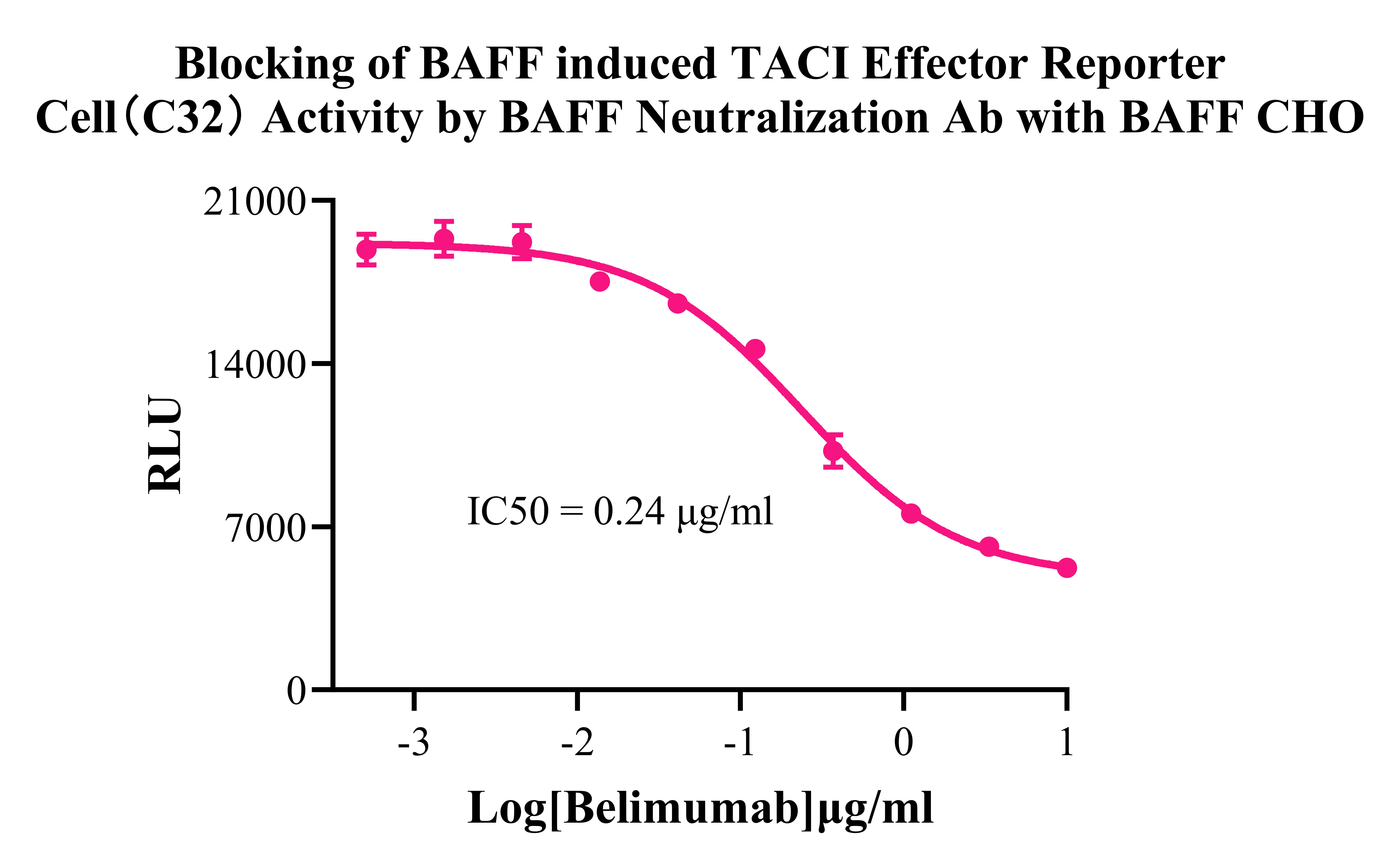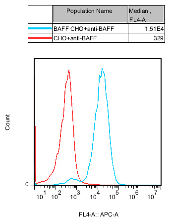 IV. Representative Data![]() Figure 1. Recombinant BAFF CHO stably expressing BAFF. ![]() Figure 2. Blocking of BAFF induced TACI Effector Reporter Cell(C32) Activity by BAFF Neutralization Ab with BAFF CHO. |