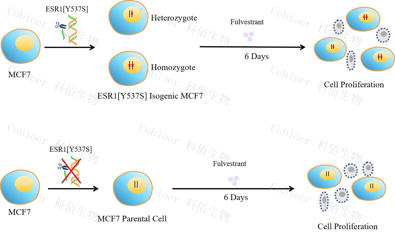 ESR1[Y537S] Isogenic MCF7 藥靶細(xì)胞,通過基因編輯的方式將 ESR1 的 537 位氨基酸酪氨酸(Y)突變?yōu)榻z氨酸(S)。![]() Figure 1. ESR1[Y537S] Isogenic MCF7 原理示意圖 |