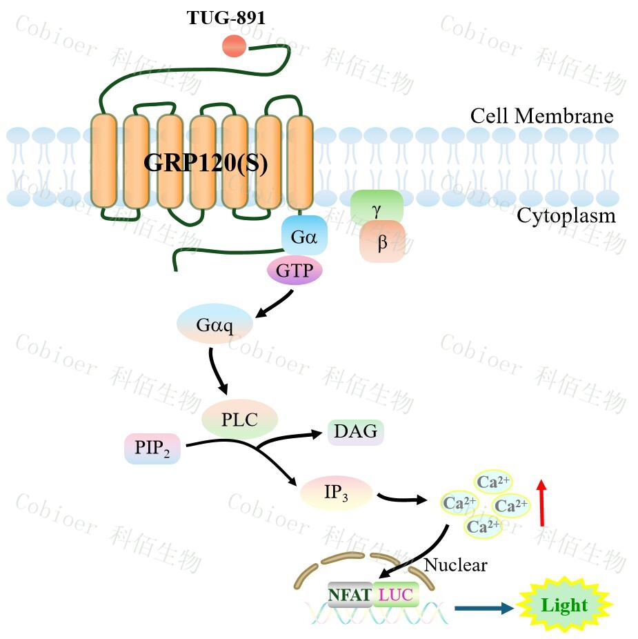 GPR120 與配體結合,導致 Gαq 亞基的激活,觸發(fā) PLC-γ,從而產(chǎn)生兩個第二信使: IP3 和 DAG,它們參與細胞內(nèi)鈣動員。鈣離子濃度升高激活了 NFAT 轉(zhuǎn)錄因子家族。 GPR120(S) NFAT-Luc HEK293 細胞藥靶模型很好的模擬了體內(nèi) GPR120 的信號轉(zhuǎn)導過程, 原理見下圖所示。