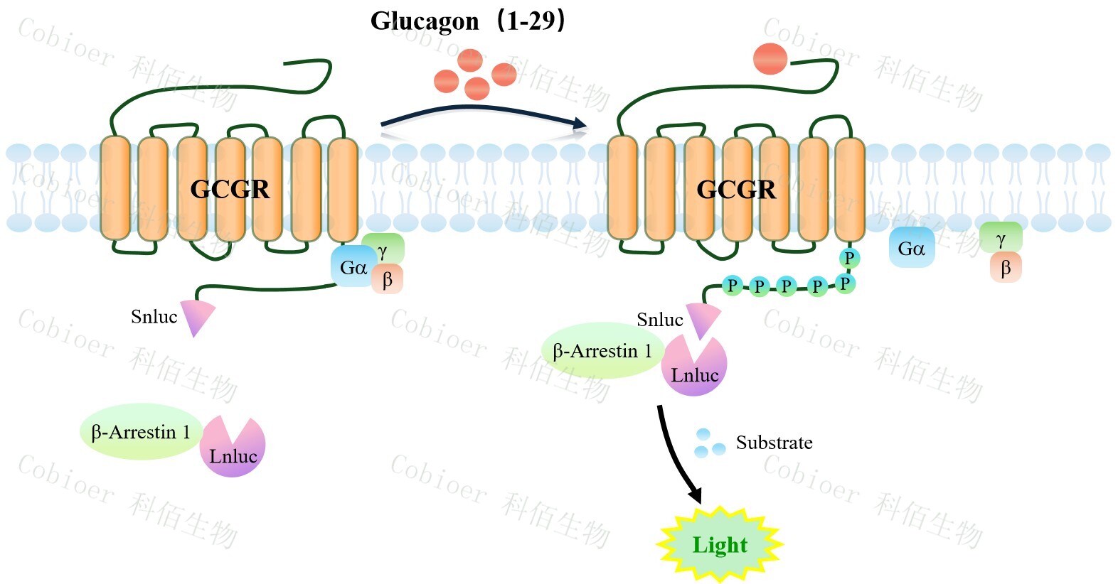 GCGR β-Arrestin 1 CHO 報(bào)告基因藥靶模型很好的模擬了體內(nèi) GCGR/β-Arrestin 1 的信 號(hào)轉(zhuǎn)導(dǎo)過程,原理見下圖所示。當(dāng)缺乏配體刺激時(shí),β-Arrestin 1 不與 GCGR 結(jié)合,融合β- Arrestin 1 的熒光素酶處于失活構(gòu)象;當(dāng) GCGR 遭遇配體刺激時(shí),融合熒光素酶報(bào)告基因的 β-Arrestin 1 被招募,使熒光素酶報(bào)告基因處于激活狀態(tài),加入其底物后發(fā)光信號(hào)增強(qiáng)。![]() Figure 1. GCGR β-Arrestin 1 CHO 細(xì)胞模型原理圖 |