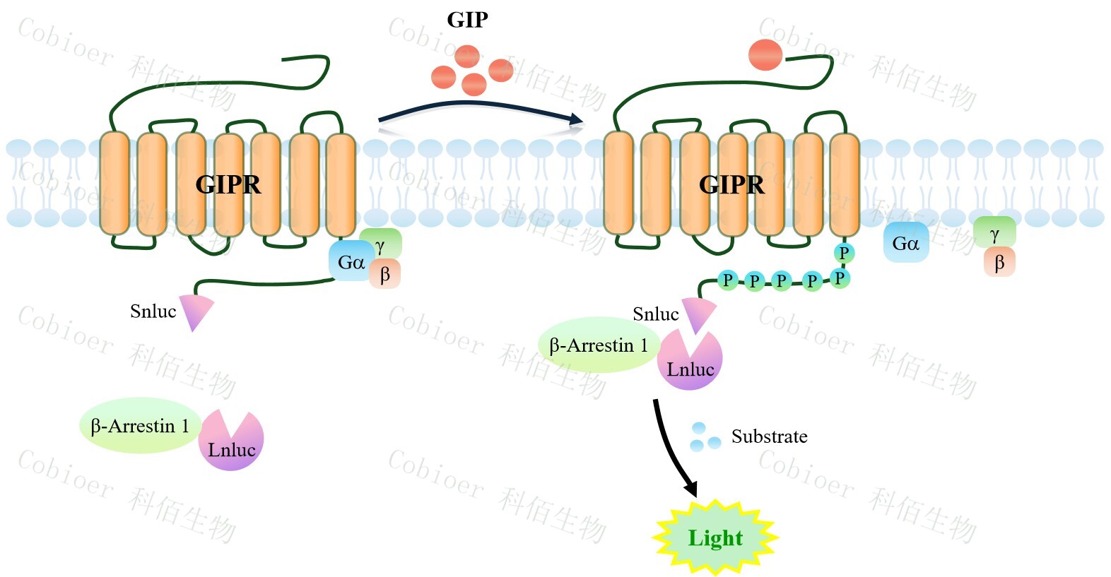 GIPR β-Arrestin 1 CHO 報告基因藥靶模型很好的模擬了體內 GIPR/β-Arrestin 1 的信號 轉導過程,原理見下圖所示。當缺乏配體刺激時,β-Arrestin 1 不與 GIPR 結合,融合β- Arrestin 1 的熒光素酶處于失活構象,當 GIPR 遭遇配體刺激時,融合熒光素酶報告基因的 β-Arrestin 1 被招募,使熒光素酶報告基因處于激活狀態(tài),加入其底物后發(fā)光信號增強。![]() Figure 1. GIPR β-Arrestin 1 CHO 細胞模型原理圖 |