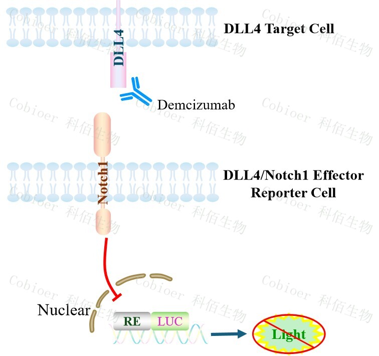 DLL4/Notch1 Effector Reporter Cell 報告基因藥靶模型很好的模擬了體內(nèi) DLL4/Notch1 的信號轉(zhuǎn)導過程,原理見下圖所示。