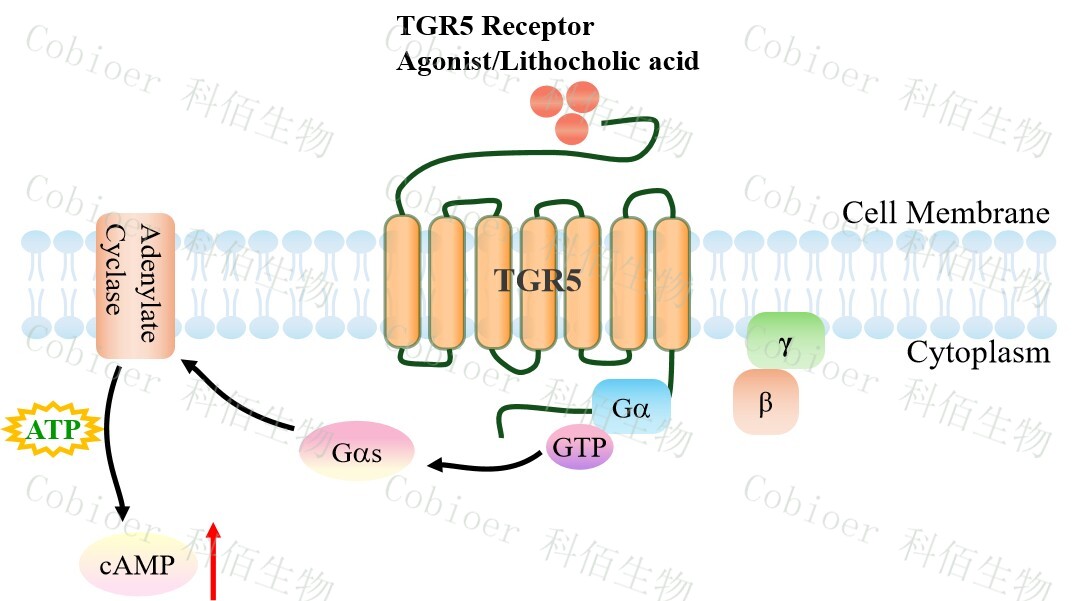 | TGR5 受體是第一個(gè)已知的膽汁酸特異性 G 蛋白偶聯(lián)受體,也被稱(chēng)為膽汁酸受體 1(GPBAR1),屬于 A 類(lèi) GPCR 亞家族。該受體由七個(gè)跨膜螺旋(TMH1-7)、三個(gè)胞外環(huán) (ECL1-3)組成,有助于配體結(jié)合,以及三個(gè)胞內(nèi)環(huán)(ICL1-3),參與將信號(hào)傳遞給下游 信號(hào)分子。TGR5 在體內(nèi)廣泛存在,在膽囊、回腸、結(jié)腸、棕色脂肪組織、脾臟、肺、骨 骼肌、胰島,肝臟中均有表達(dá)。有文獻(xiàn)報(bào)道 TGR5 被認(rèn)為是治療代謝性疾病(如 2 型糖尿 ?。┑臐撛诎悬c(diǎn)。此外,TGR5 還能降低單核細(xì)胞中促炎細(xì)胞因子的水平,在炎癥過(guò)程 (包括結(jié)腸炎和動(dòng)脈粥樣硬化)中發(fā)揮核心作用的病理調(diào)節(jié)。 | |