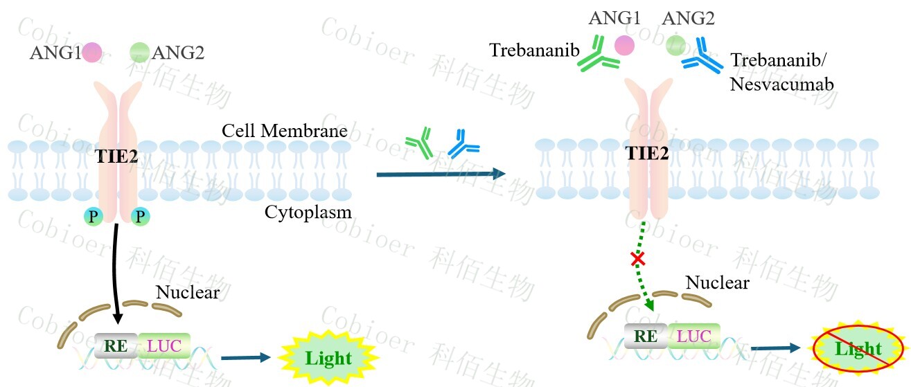 ANG/TIE2 Effector Reporter Cell 報告基因藥靶模型很好的模擬了體內 ANG/TIE2 的信 號轉導過程,原理見下圖所示。![]() Figure 1. ANG/TIE2 Effector Reporter Cell 細胞模型原理圖