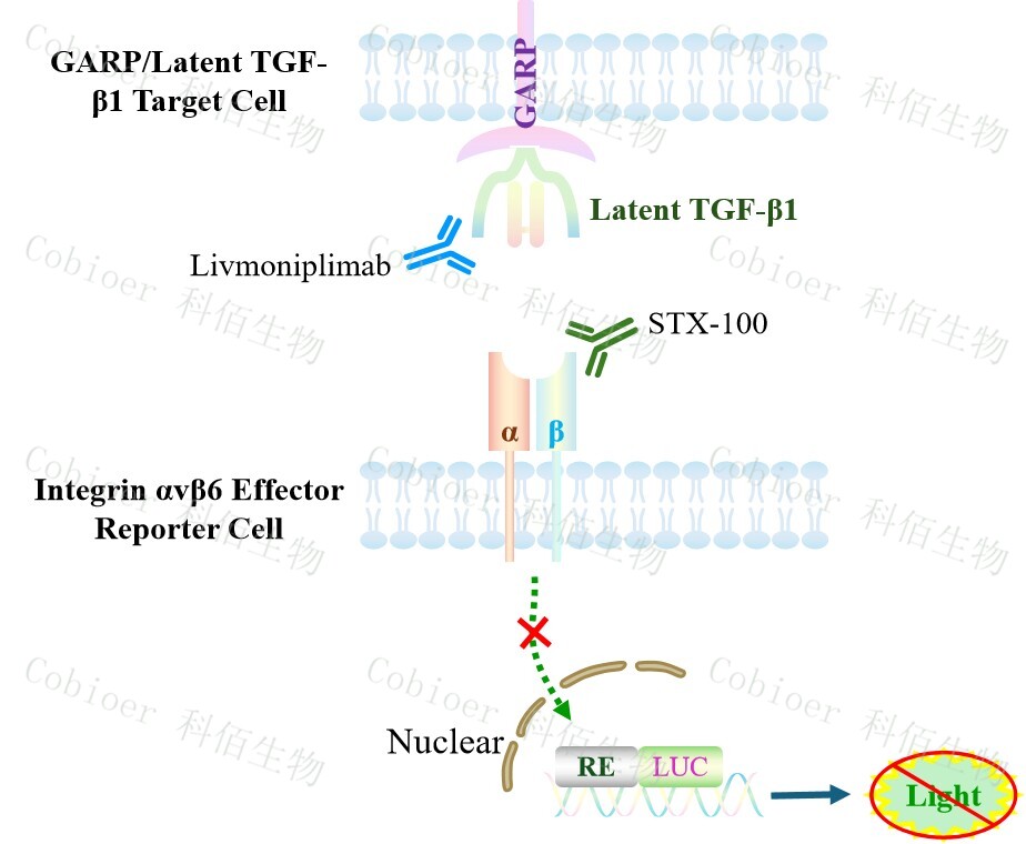 GARP/Latent TGF-β1 Target Cell 作為 Integrin αvβ6 Effector Reporter Cell 的靶細(xì)胞,藥 靶模型很好的模擬了體內(nèi) Integrin&GARP/Latent TGF-β1 的信號(hào)轉(zhuǎn)導(dǎo)過(guò)程,原理見下圖所示。![]() Figure 1. GARP/Latent TGF-β1 Target Cell 細(xì)胞模型圖 |