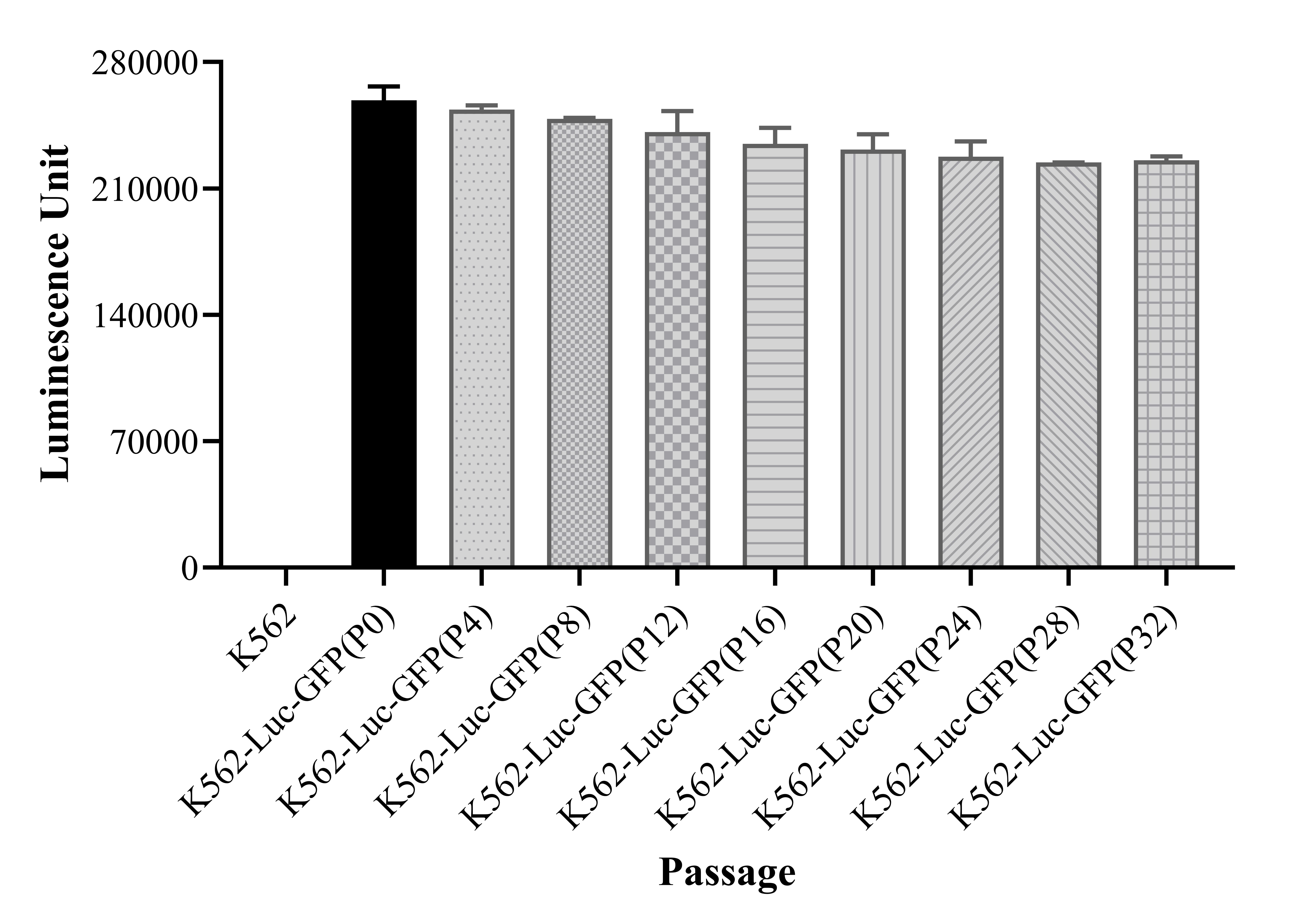 Figure 2. Stablity test results. K562-Luc-GFP showed at least 32 passage stability with similar luminescence unit. |