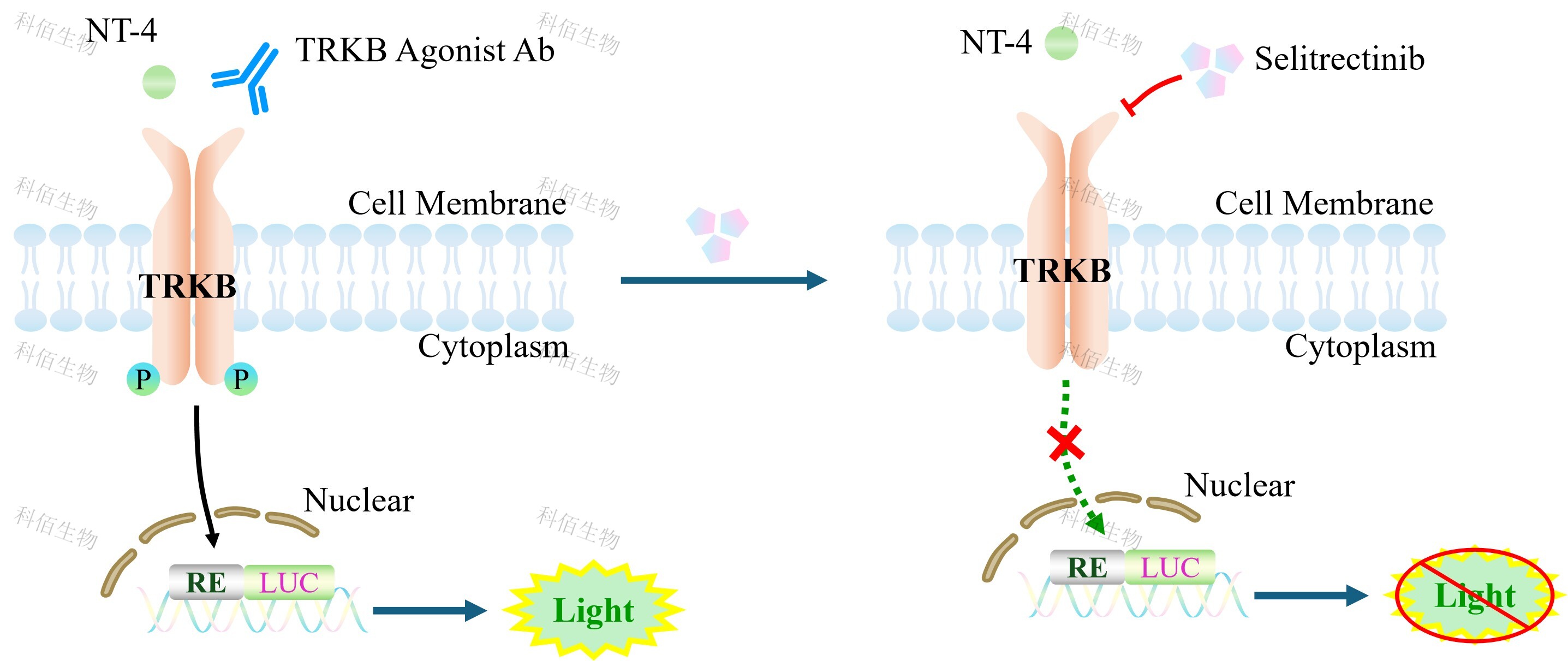 TRKB Effector Reporter Cell 報(bào)告基因藥靶模型很好的模擬了體內(nèi) TRKB 的信號(hào)轉(zhuǎn)導(dǎo)過(guò)程,原理見(jiàn)下圖所示。![]() Figure 1. TRKB Effector Reporter Cell 模型原理圖 |