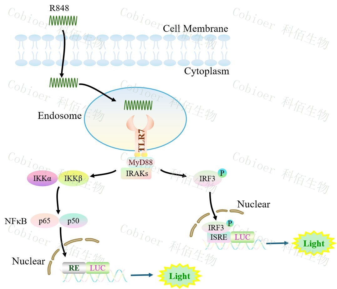 TLR7 NFκB&ISRE Dual Reporter Cell 報(bào)告基因藥靶模型很好的模擬了體內(nèi) TLR7 的信號(hào)轉(zhuǎn)導(dǎo)過程,原理見下圖所示。![]() Figure 1. TLR7 NFκB&ISRE Dual Reporter Cell 細(xì)胞模型原理圖 |
