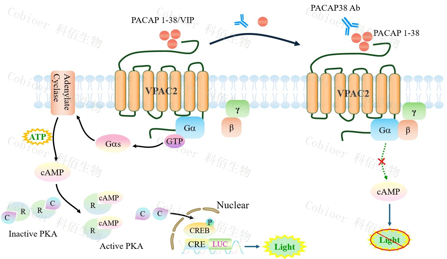 | PACAP/VIP 受體家族屬于 B 類 G 蛋白偶聯(lián)受體(GPCR),包含 PAC1R (PAC1)、 VPAC1R (VPAC1) 和 VPAC2R (VPAC2) 三個亞型,共同響應(yīng)神經(jīng)肽 PACAP(垂體腺苷酸 環(huán)化酶激活肽)和 VIP(血管活性腸肽)的調(diào)控,通過激活 Gs/cAMP-PKA 核心信號軸 (部分亞型偶聯(lián) Gq/PLC)廣泛協(xié)調(diào)神經(jīng)內(nèi)分泌、代謝穩(wěn)態(tài)與免疫調(diào)節(jié)。 VPAC2 受體(血管活性腸肽受體 2 型)作為 B 類 GPCR 的核心亞型,主要富集于下丘 腦視交叉上核(SCN)、胰腺β細(xì)胞、脂肪組織及骨細(xì)胞,以同等高親和力結(jié)合 VIP 和 PACAP,通過 Gs/cAMP-PKA 通路調(diào)控代謝穩(wěn)態(tài)與晝夜節(jié)律。VPAC2 的激活可同步 SCN 生物鐘基因(如 Per2)振蕩以維持睡眠-覺醒周期、促進(jìn)胰島素/胰高血糖素脈沖式分泌調(diào) 控血糖平衡、抑制破骨細(xì)胞分化并增強(qiáng)骨形成。 | |