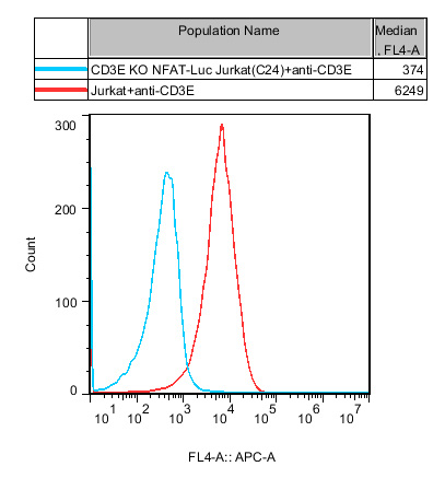![]() Figure 2. CD3E KO 的測序結(jié)果[CD3E(NM_000733.4):c.397_398ins4bp/CD3E:p.I133Kfs] ![]() Figure 3. CD3E KO NFAT-Luc Jurkat 細胞,在 NFAT-Luc Jurkat 細胞上敲除 CD3E。 ![]() Figure 4. Dose Response of CD3 Agonist Antibody in CD3E KO NFAT-Luc Jurkat (2C24).