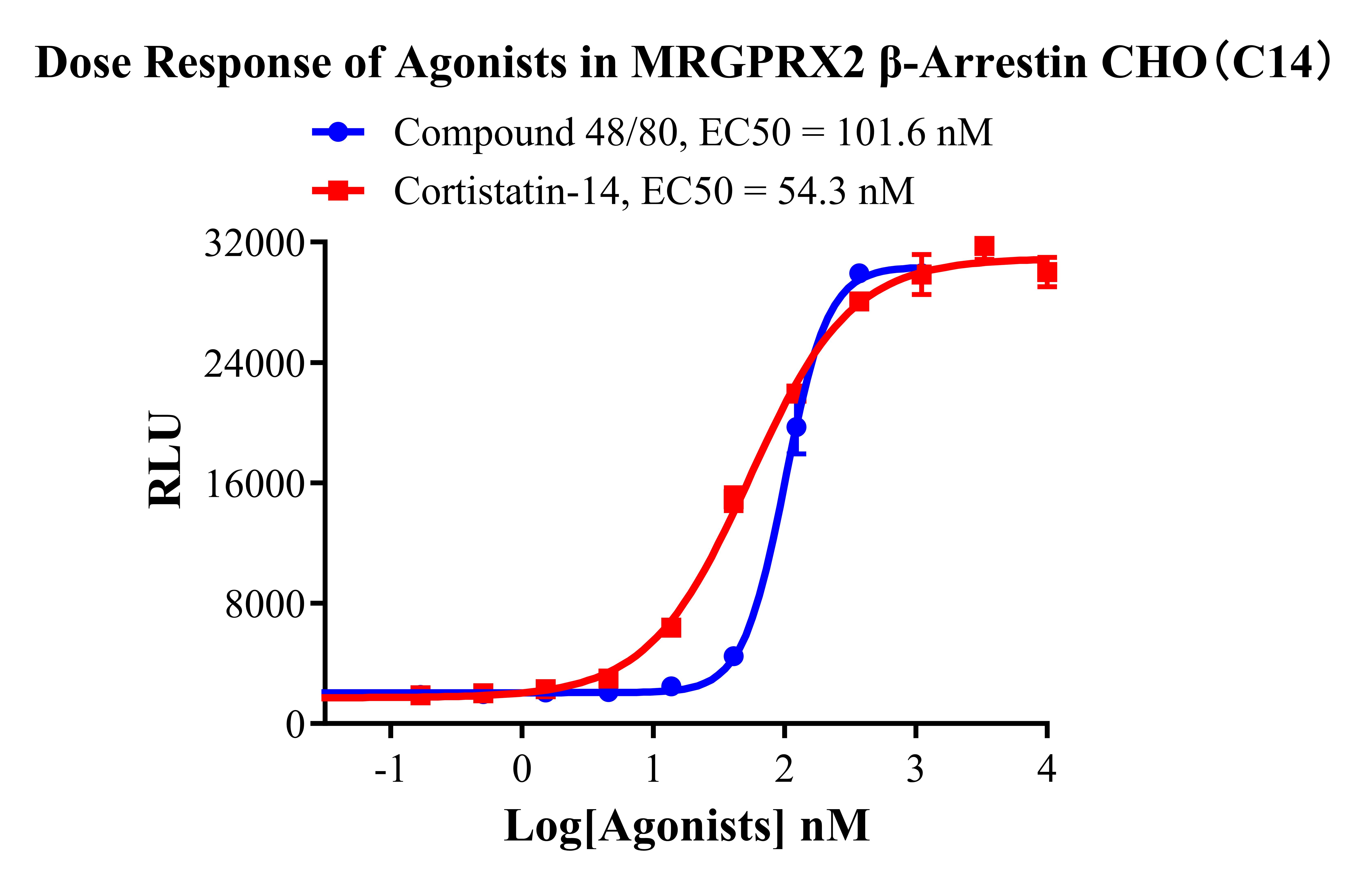 MRGPRX2 β-Arrestin CHO 報告基因藥靶模型很好的模擬了體內(nèi) MRGPRX2/β-Arrestin 的信號轉(zhuǎn)導過程,原理見下圖所示。當缺乏配體刺激時,β-Arrestin 不與 MRGPRX2 結(jié)合, 融合β-Arrestin 的熒光素酶處于失活構(gòu)象;當 MRGPRX2 遭遇配體刺激時,融合熒光素酶報 告基因的β-Arrestin 被招募,使熒光素酶報告基因處于激活狀態(tài),加入其底物后發(fā)光信號增 強。![]() Figure 1. MRGPRX2 β-Arrestin CHO 細胞模型原理圖 |