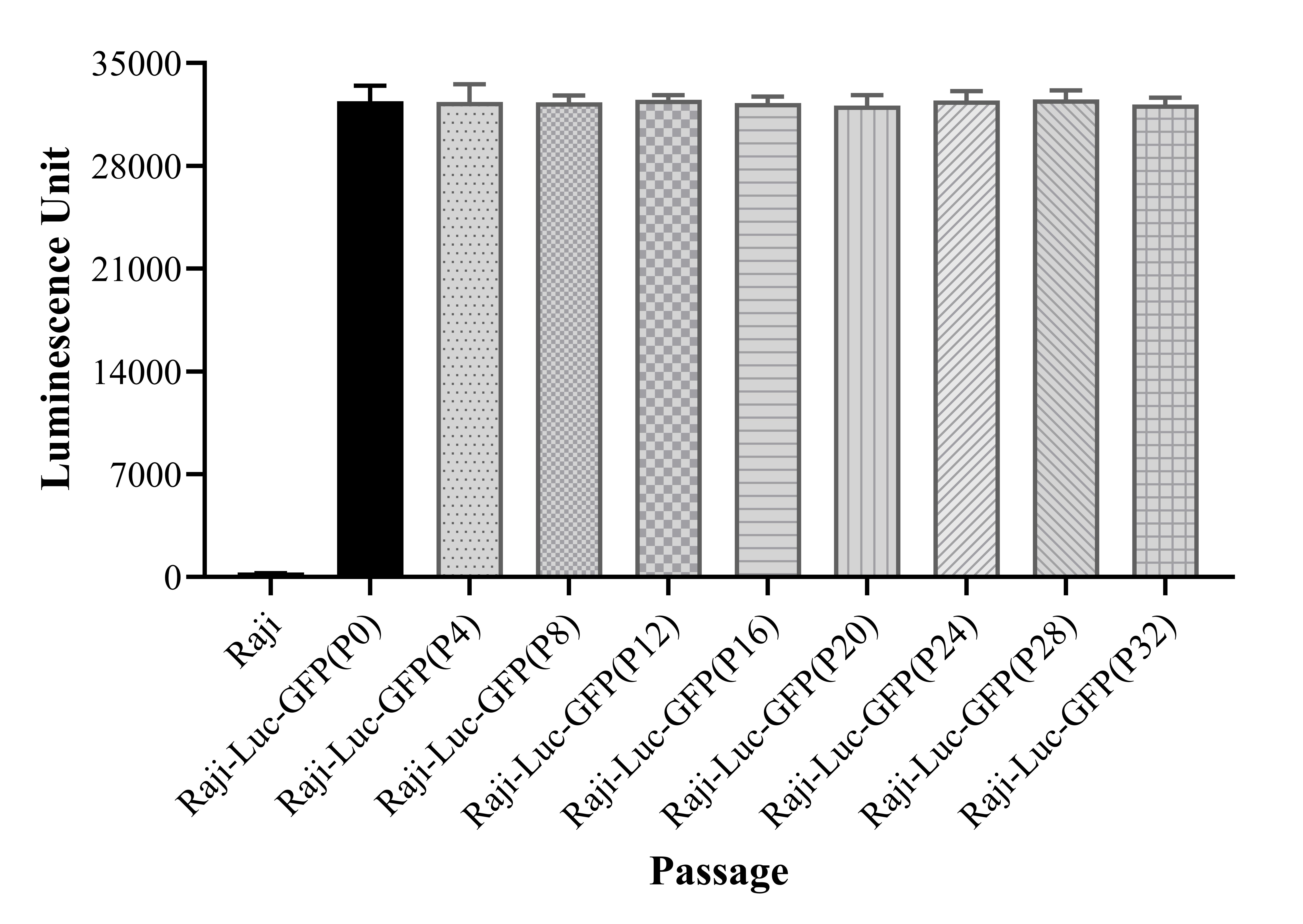 Figure 2. Stablity test results. Raji-Luc-GFP showed at least 32 passage stability with similar luminescence unit. |
